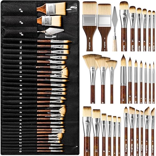 Nicpro 30pcs Paint Brush Set, Professional Paintbrushes with Paint Spatula and Cloth Roll, Craft Paint Brushes for Acrylic Painting, Oil, Watercolor, Gouache, Art Supplies for Artists and Beginners