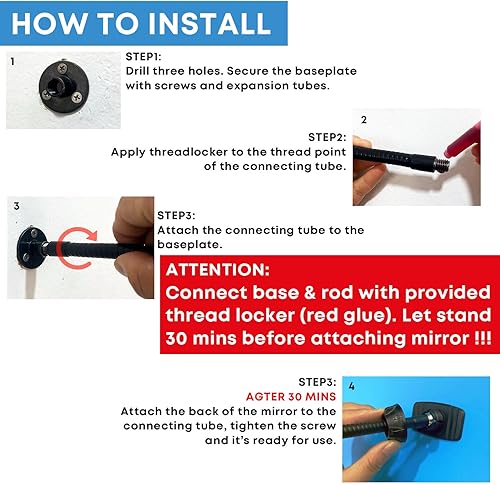 ASSEMBLY TIP: Connect base & rod with provided thread locker (red), Let stand 30 mins before attaching mirror!!!