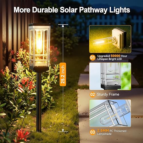 2X Bigger and Taller & 2.5MM Thickened Lampshade Design: Elevate your outdoor aesthetic with our 25-inch walkway solar lights- a full 10 inches taller than conventional designs, creating an undeniably premium presence. Solar landscape pathway lights constructed from strength ABS shell material and paired with an industry-leading 2.55MM thickened lampshade—up to 60% thicker than standard outdoor solar lights for superior impact resistance. Whether lining a driveway, accenting a pond, or framing a pergola, they deliver 30% more luminosity than conventional options