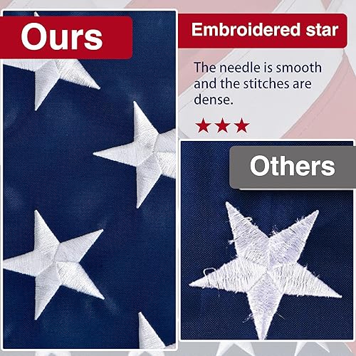 【Exquisite Embroidered Stars, Expert Craftsmanship】Each star is individually embroidered with double-stitched precision for a polished look. The flag's edges are reinforced with four rows of stitching and double-lock stitching to resist fraying and tearing.