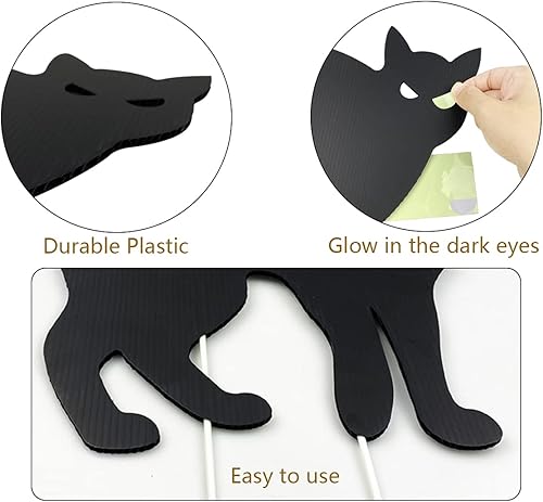 6 Styles - There are 6 different styles black cats with unique design, set up it in your yard, it looks real from a distance, especially paste the glow in the dark eyes, it's scary at the Halloween night