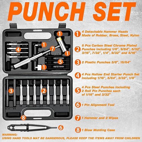 2.All-IN-1 Set: Includes everything you need to get started and suitable for everyone, whether you're a novice or a veteran. This punch set includes 1/8", 9/64", 5/32", 3/16", 7/32", 1/4", 9/32" and 5/16". 2Pcs 3/8",15/64" plastic pin punches; 1 metal tweezers and 1 hammer with 4 detachable hammer heads; 4Pcs hollow end starter punch set including 1/16”,5/64”,3/32”,1/8”; 2 Pcs flat pin punches including 1/16" and 3/32"; 2 Pcs roll pin punches including 1/16" and 3/32"; 8Pcs carbon steel punches.