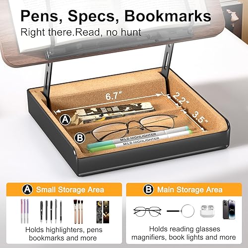 【Storage Convenience】Integrated storage box keeps bookmarks, pens, and glasses within reach, ensuring uninterrupted hands-free reading and better desk organization.