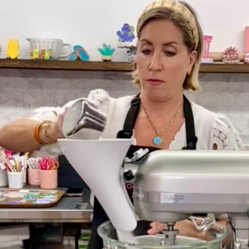The Countess Flour Funnel attaches firmly to a stand mixer's auxiliary port, and it is angled just right to easily add your flour (or any dry or liquid ingredients) to your bowl.
