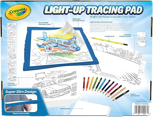 CRAYOLA LIGHT-UP TRACING PAD: Includes 1 Tracing Pad, 12 Short Colored Pencils, 10 Tracing Sheets (with multiple mix-and-match designs), 10 Blank Sheets, and 1 Graphite Pencil. (Requires 3 AA batteries, sold separately.)