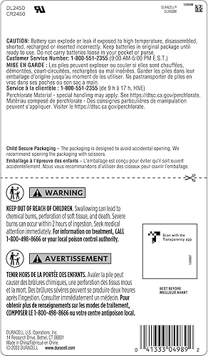 CHILD-SECURE PACKAGING: Duracell Lithium Coin CR 2450 3 Volt battery packaging is nearly impossible to open without scissors, keeping these circle, button-sized watch batteries secure