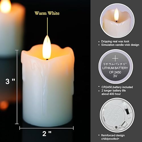 【Made of Real Wax】new 3D flameless pillar candles, each electric candle measures 2 x 3 inches. Melted edge design, real drip wax appearance, black wick, and simulated traditional burning candles flickering new 3D flameless. All this gives a more vivid and realistic appearance, instead of burning candles, which creates a soothing and relaxing ambiance