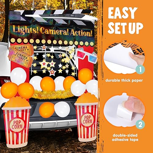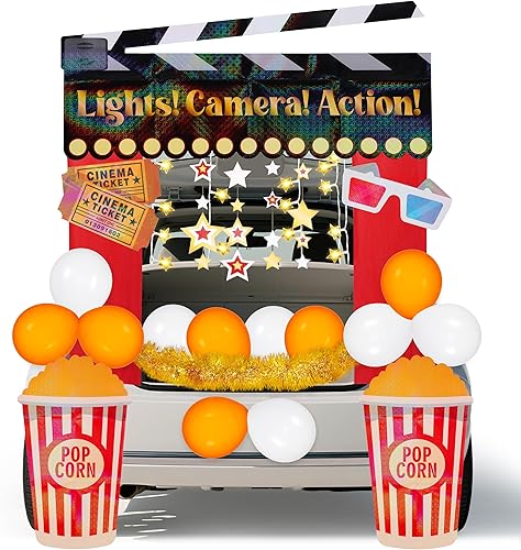 Unique Cinema Design: Roll out the red carpet for our cinema-themed decorations! With iconic movie elements like clapperboards, popcorn buckets, tickets, and 3D glasses, this kit brings the magic of the silver screen to your Halloween festivities. Elevate the ambiance of most occasions with our trunk or treat car decorations kit for trucks, featuring a vibrant red color scheme and playful red carpet design, increasing the festival touch to add excitement to your events.