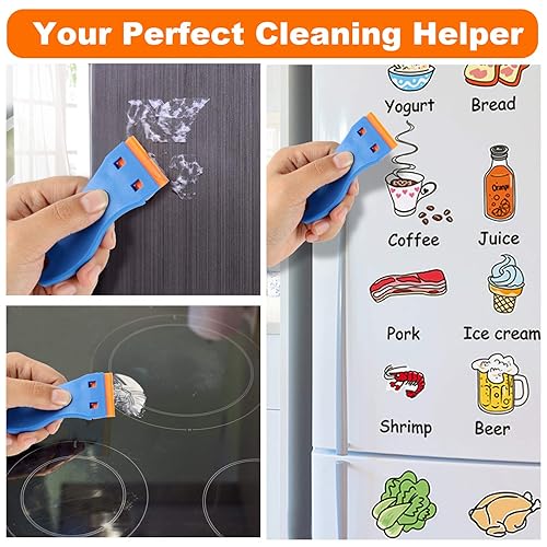 SAFE CLEANING SCRAPER TOOL: Two slots on the back of the blade scraper securely hold the plastic razor blades to ensure that the blade will not slip out. The plastic blade is sharp but safe, you won't worry about this scraper multitool cutting your fingers while working