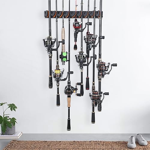 STORE 9 RODS OR COMBOS - The PLUSINNO vertical fishing rod holder can store up to 9 rods or combos neatly and securely in less than 16 inches of horizontal wall space.Most other brands can only store 3 or 6 combos in the same amount of space. Fishing rods and reel combos can be mounted on the rack at any position of rod length, which make the reels can be staggered at different heights to minimize storage space.