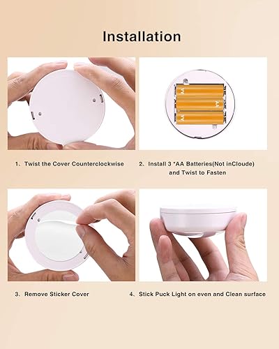 EASY TO INSTALL - The puck light powered by 3 x AA batteries per wireless LED under cabinet light (batteries not included), quick installed with original 3M adhesive tapes(6pcs included), strong in pasting without scratching the furniture. Simply replace the batteries by twisting the puck light off of its base and insert new batteries.