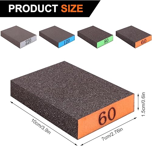 【ASSORTED GRIT SANDING BLOCKS】 Each set contains 8 sponge sanding blocks, each measuring 3.9 x 2.76 x 0.6 inches. There are 4 sizes from coarse to ultra-fine, 2 blocks of each grit level, and different colors for different grit sizes: grey (corresponding to grit size - 220), blue (120), green (80), and orange (60).