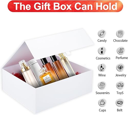 SIZE:White gift box outside size is 7.8x7x3.1 Inches(Inside size:7.4x6.8x3 inches),can hold gifts such as jewelry,candy,mini bottle of wine,soaps,Perfume,Lipsticks,watch,Belt,phone,the best size for your small gifts package.