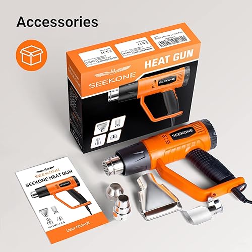 ⏩【1800W Strong Power With 2 Settings】This heat gun features two modes with two heat outputs, I: 752℉, 250L/min, II: 1112℉, 500L/min. With a strong power of 1800W, this hot air gun can quickly heat up to 1112℉ in seconds. The SEEKONE Heat Gun has nearly unlimited versatility, generates enough hot air for almost any project, especially if you are a crafter, or DIYer