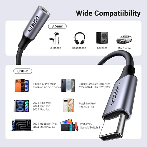 Wider Compatibility: The USB C Aux Dongle fits most USB-C phones tablets, and laptops, compatible with iPhone 17 Pro Max/17 Pro/Air/17/16 Pro Max/16 Pro/16 Plus/16/15 Pro Max/15 Pro/15 Plus/15, Samsung Galaxy S25/S25+/S25 Ultra/S24/S24+/S24 Ultra/S23/S23 Ultra/S23+/S22/S22 Ultra/S22+/S21/S21 Ultra/S21+, Google Pixel 10 Pro/10 Pro XL/10/10 Pro Fold/9 Pro XL/9/9 Pro/8/8 Pro/7/7 Pro, iPad mini/iPad Pro/iPad Air, iMac, Macbook Pro/Macbook Air, Mac mini, PS5, Switch 2