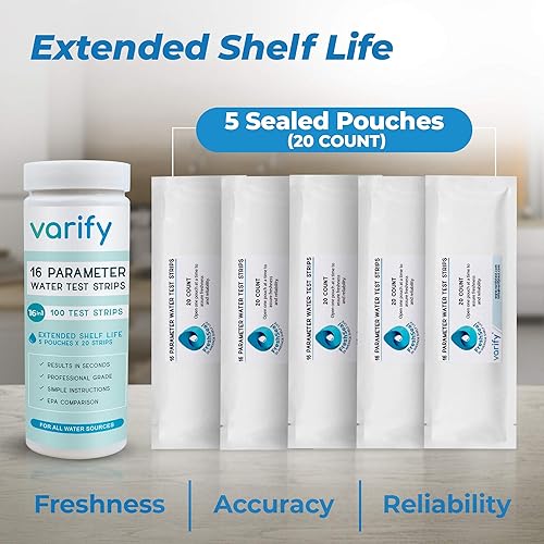 ACCURATE AND RELIABLE: Varify's water test kit comes with 100 strips in 5 separately sealed pouches (20 strips each), preserving freshness and extending shelf life for dependable testing. It also includes 2 easy-to-use bacteria tests that deliver results in 48 hours, ensuring thorough and accurate assessment of your water's safety and cleanliness. This design ensures precision and convenience in monitoring your water quality.